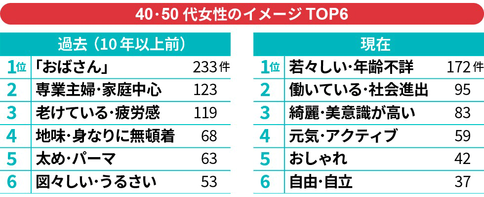 「あなたが『40・50代女性』と聞いて思い浮かべるイメージはどういったものですか」という質問で、過去(10年以上前)と現在について、それぞれ想起することの自由回答を集計して上位6位までをまとめています(図1)。