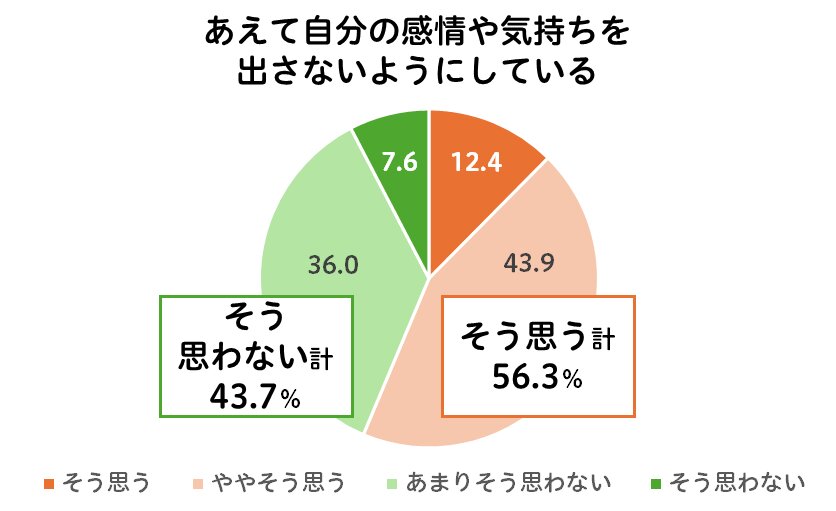 先ほどの3つの仮説に近いデータはグラフで示した通り、いずれも4割台と一定の割合に達したものの、過半数には及びませんでした。そのなかで私たちが注目したのは、過半に達した「あえて自分の感情や気持ちを出さないようにしている」というデータでした。