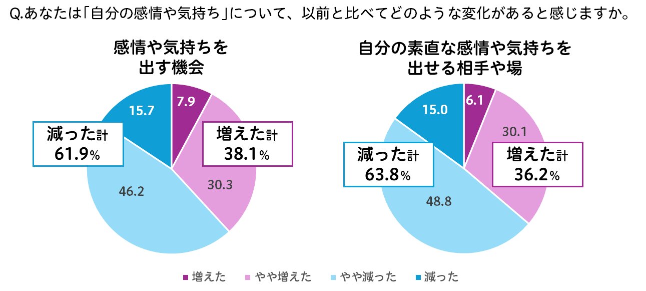 そこで、「感情を出す/出さない」ということに焦点を当ててデータをみていくと、感情や気持ちを出す機会、出せる相手や場の増減は4:6でいずれも「減った」が多いことがわかってきました。一時点の調査ではありますが、感情を「出さなくなっている」傾向がありそうです。