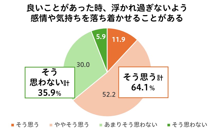 また、調査データでも「良いことがあった時、浮かれ過ぎないよう感情や気持ちを落ち着かせることがある」はそう思うが計64.1%という結果で、同様の考え方をする生活者の存在も浮き彫りになりました。