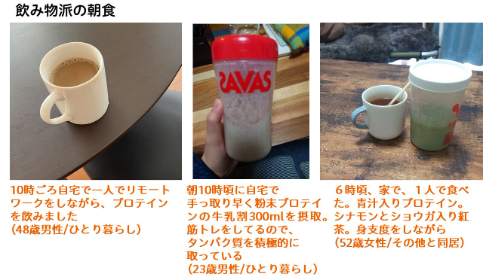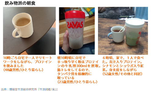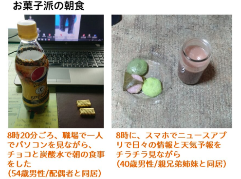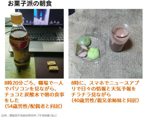 では、フルーツ派やヨーグルト派が元々一定数いる朝食は、どんな食卓風景なのでしょうか。朝食の簡便化がさらに進むと「飲み物派」や「お菓子派」が現れます。つまり、朝食の「間食化」といったところでしょうか。