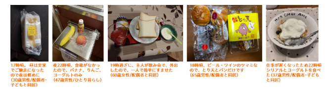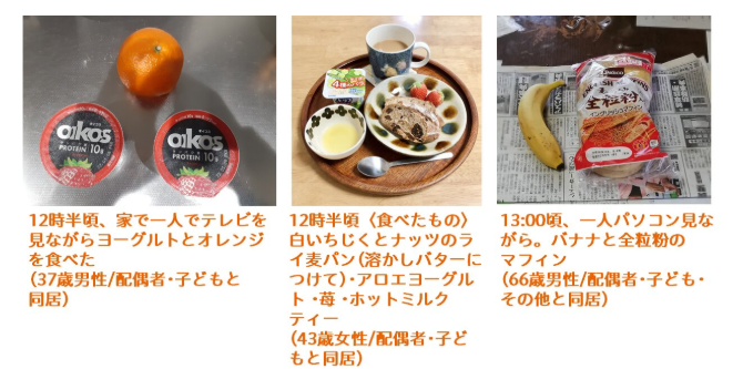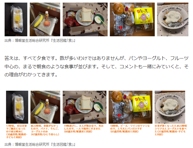 さっそくですが、こちらの写真をご覧いただきたいと思います。生活図鑑のなかから、何名かの食卓写真を並べていますが、この食事はそれぞれ、朝食、昼食、夕食のうちのどれだと思いますか?