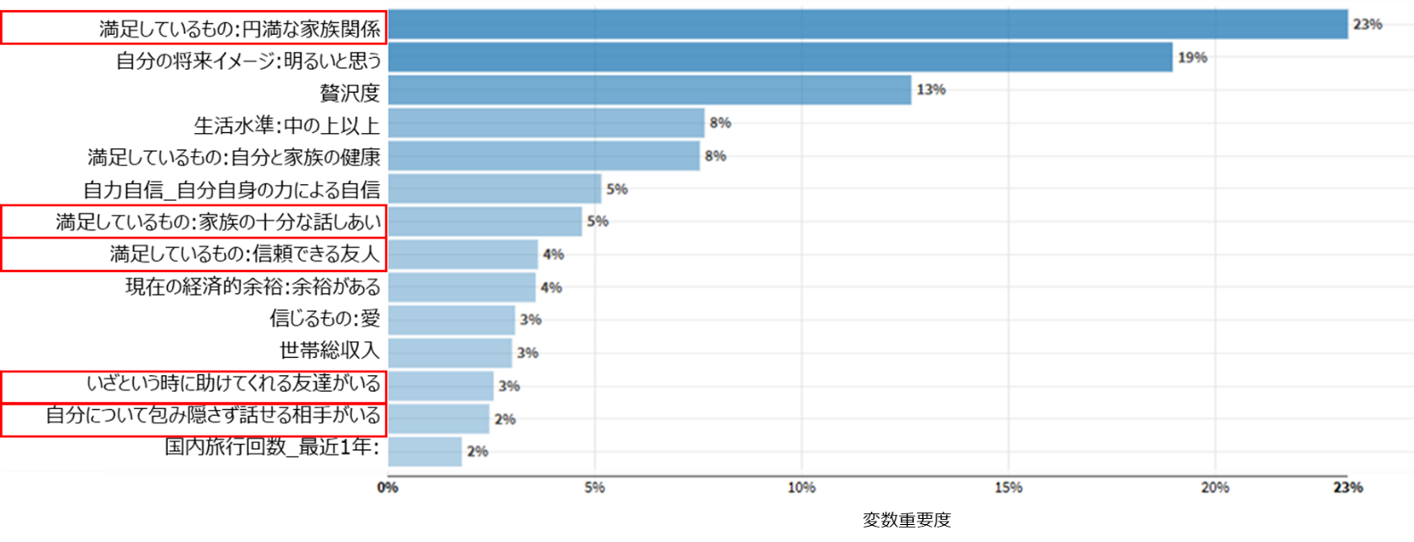次に特徴的だったのが、人間関係に関する項目です。 最も影響度が高かったのは「満足しているもの:円満な家族関係」(重要度1位)でした。これ自体は納得の結果です。