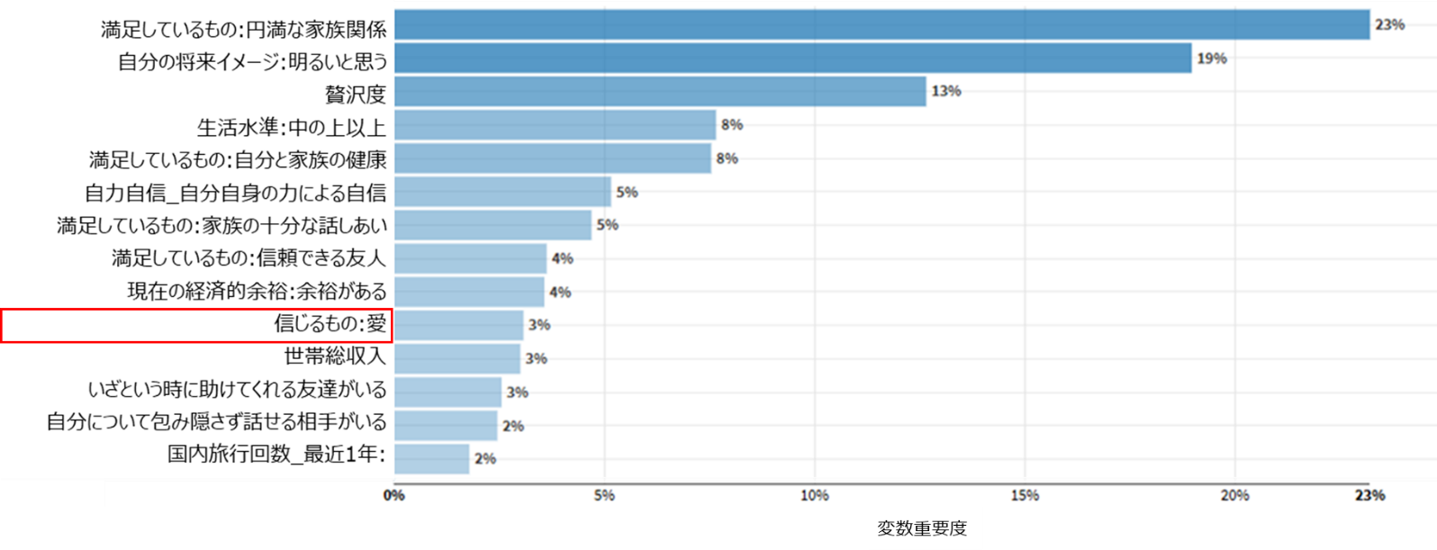分析結果を見て、幸福度に極めて大きな影響を与えていたのが、「自分の将来イメージ:明るいと思う」でした。各項目が幸福度を「どれくらい押し上げたか(または押し下げたか)」を示す変数重要度では2位となっています。