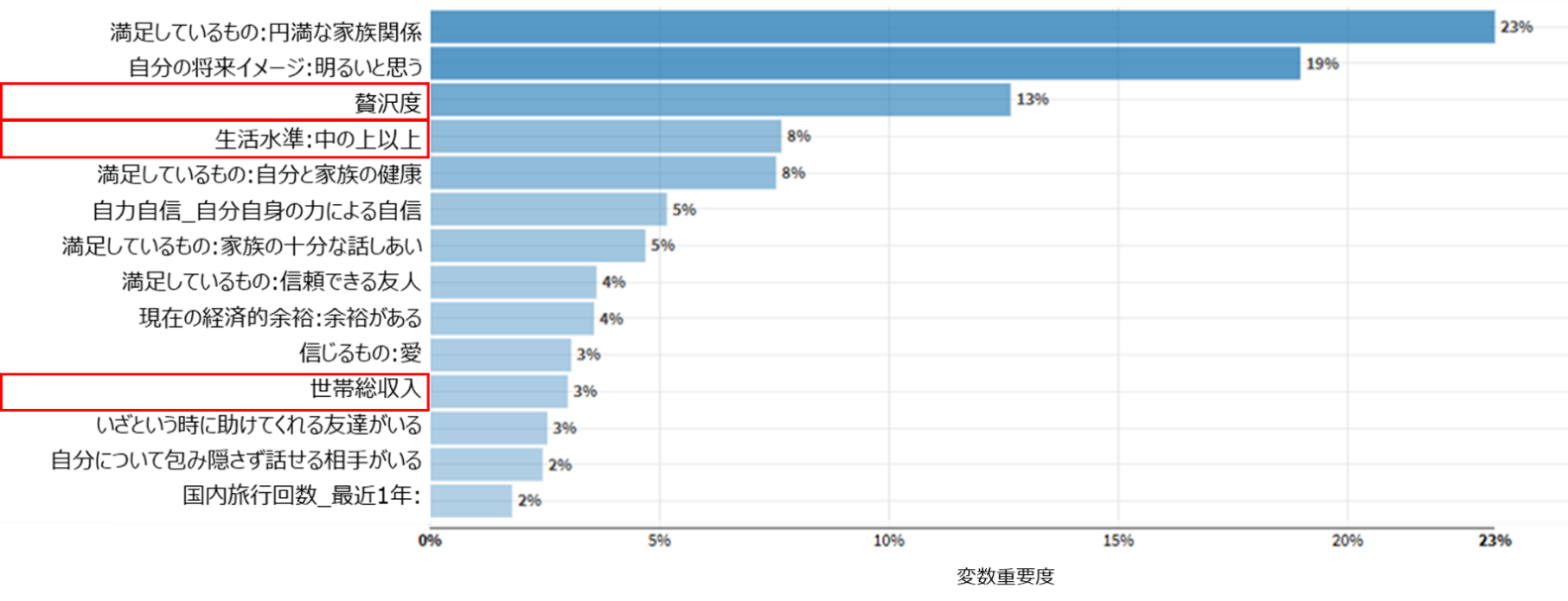 「贅沢度」(重要度3位)や「生活水準:中の上以上」(重要度4位)が、実数としての「世帯総収入」(重要度11位)よりも上位に来ているのです。