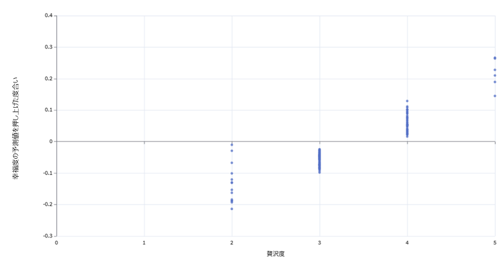 ◆しかし、一方で「贅沢度(自分は贅沢をしているという実感 ※5段階)」という項目には、そのような飽和点が見当たりません。この数値は、上がれば上がるほど、幸福度を押し上げていました。