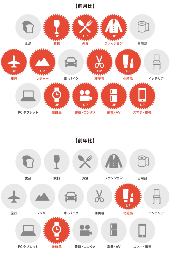 - 16カテゴリー別の消費意向をみると、前月比では「ファッション」「旅行」「外食」「化粧品」「理美容」「レジャー」「飲料」「スマートフォン・携帯電話」「家電・AV」など、11カテゴリーが20件以上増加しています。前年比では「化粧品」「装飾品」が20件以上増加しました。春に向けて、外出関連や新生活準備に関するカテゴリーで、前月から消費意向が高まっていることがうかがえます。