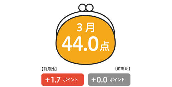 2026年3月の消費意欲指数は44.0点。前月比では+1.7ptと上昇し、前年比では±0.0ptで横ばいとなりました。